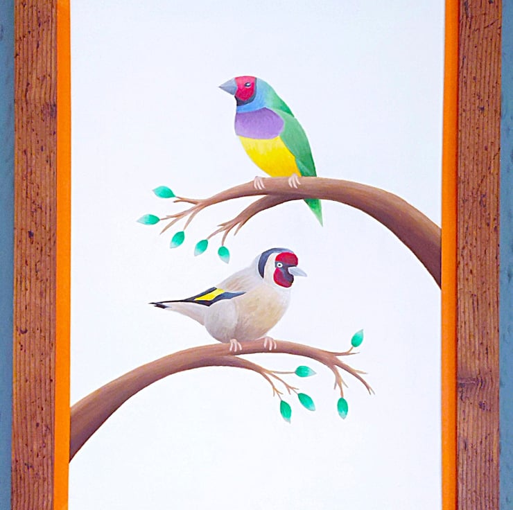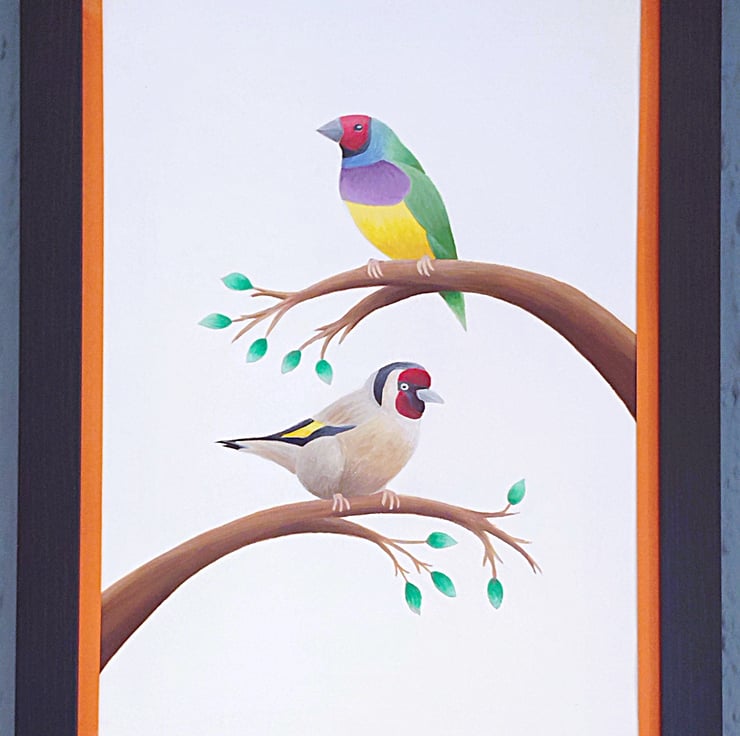 Framed high-quality coloured A3(42cm x 30cm) Giclee print of my painting of a Gouldian Finch and a Goldfinch perched on branches on a white background with a hard backing. The print comes finished with a stylish, modern orange border. Framed with an expensive Styrene Protective Perspex (which has same clarity of glass) ready to hang. Buyer can choose from three types of frame; Black, Oak or Dark Oak. Colours of print with border may differ slightly due to computer/phone settings. All purchases delivered within 7-10 working days.