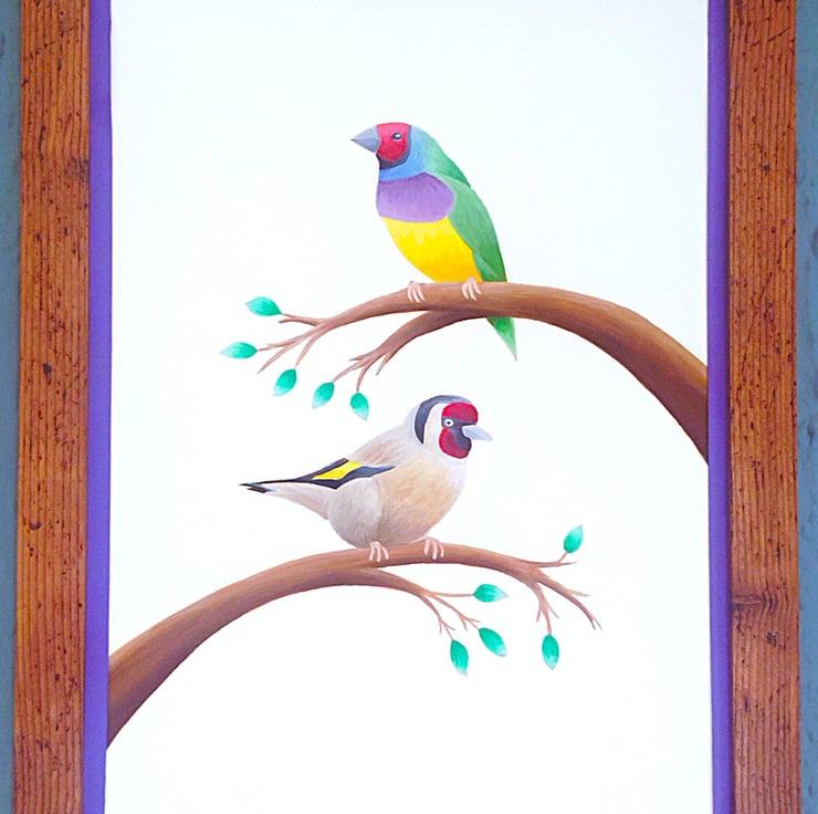Framed high-quality coloured A3(42cm x 30cm) Giclee print of my painting of a Gouldian Finch and a Goldfinch perched on branches on a white background with a hard backing. The print comes finished with a stylish, modern purple border. Framed with an expensive Styrene Protective Perspex (which has same clarity of glass) ready to hang. Buyer can choose from three types of frame; Black, Oak or Dark Oak. Colours of print with border may differ slightly due to computer/phone settings. All purchases delivered within 7-10 working days.