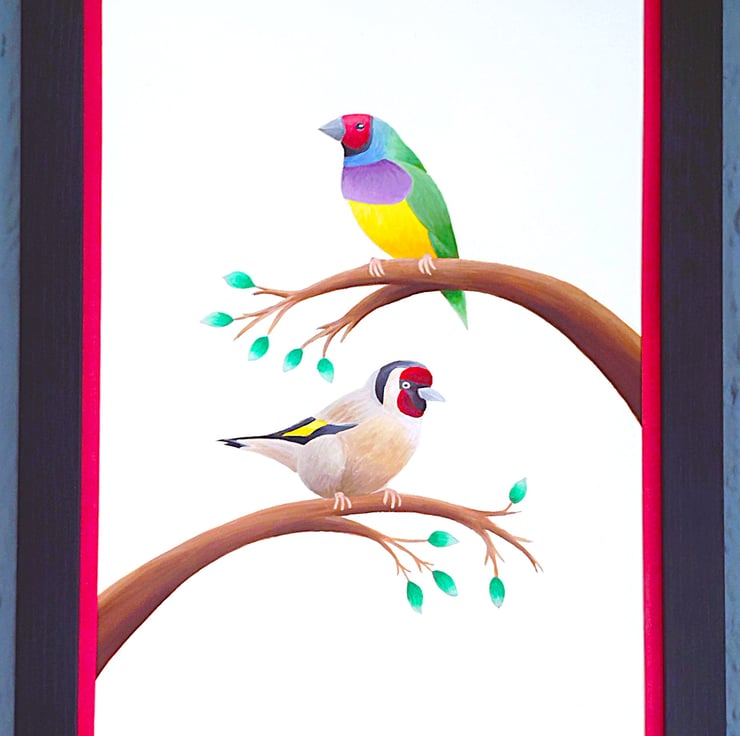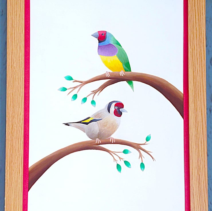 Framed high-quality coloured A3(42cm x 30cm) Giclee print of my painting of a Gouldian Finch and a Goldfinch perched on branches on a white background with a hard backing. The print comes finished with a stylish, modern red border. Framed with an expensive Styrene Protective Perspex (which has same clarity of glass) ready to hang. Buyer can choose from three types of frame; Black, Oak or Dark Oak. Colours of print with border may differ slightly due to computer/phone settings. All purchases delivered within 7-10 working days.