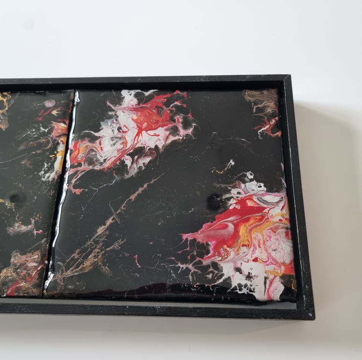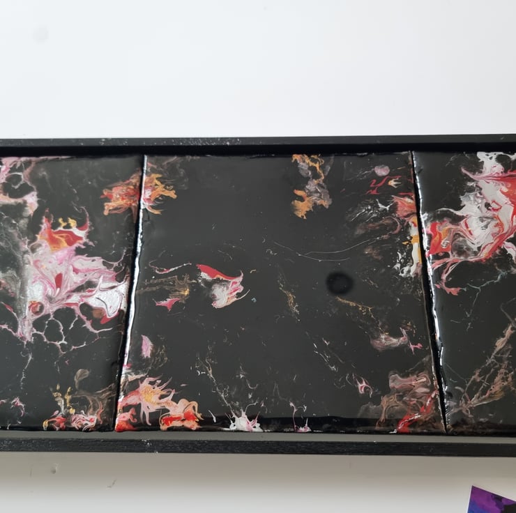 This Triptych is created using Acrylic pigments and a pouring medium, which allows the colours to flow on the three canvas boards. The bold black background allows the finer details to stand out. Two coats of resin will protect the painting from knocks and the UV rays in sunlight. The canvas boards are mounted on 5mm MDF sheets and then finished with a homemade black wooden frame. Fittings are supplied.