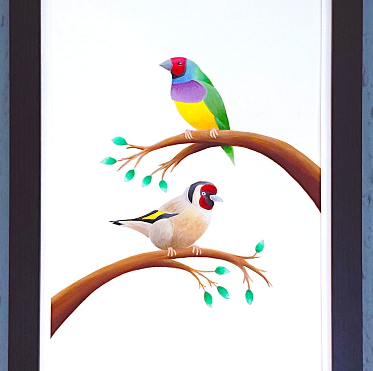 Framed high-quality coloured A3(42cm x 30cm) Giclee print of my painting of a Gouldian Finch and a Goldfinch perched on branches on a white background with a hard backing. The print comes finished with a stylish, modern white border. Framed with an expensive Styrene Protective Perspex (which has same clarity of glass) ready to hang. Buyer can choose from three types of frame; Black, Oak or Dark Oak. Colours of print with border may differ slightly due to computer/phone settings. All purchases delivered within 7-10 working days.