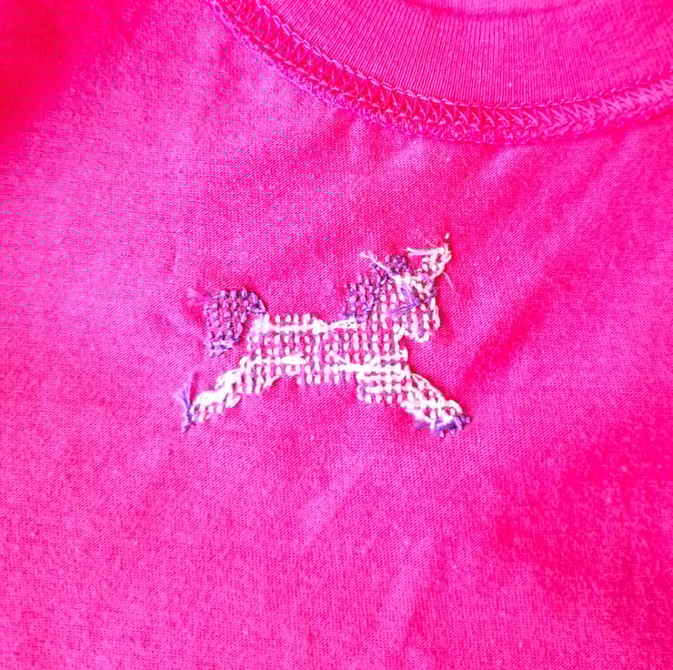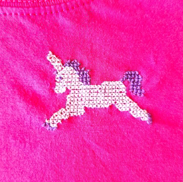A white hand-stitched unicorn prances across the left front of this deep pink T-shirt. It has a sparkly ivory horn and purple eye, mane, tail and hooves. As I never use a permanent backing material when hand embroidering kids' clothing, there is nothing inside the shirt to irritate your child's skin. The shirt has a round neck and short sleeves. It is all cotton and can be machine washed.