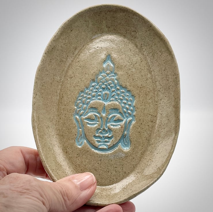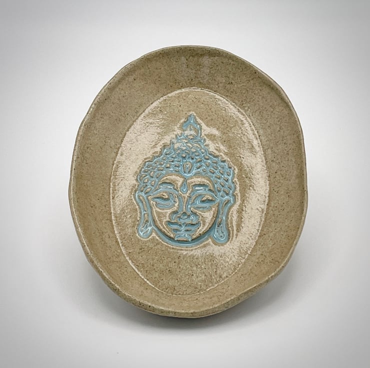 This handcrafted ceramic stoneware dish has been created using the slab-work method and embossed with a Buddha design before it is shaped into a mould. Once dried it has been bisque fired to 1000c, after a gentle sanding it has been hand-painted using a turquoise underglaze with a clear glaze added. After glazing it has had a second firing in the kiln to 1250c.