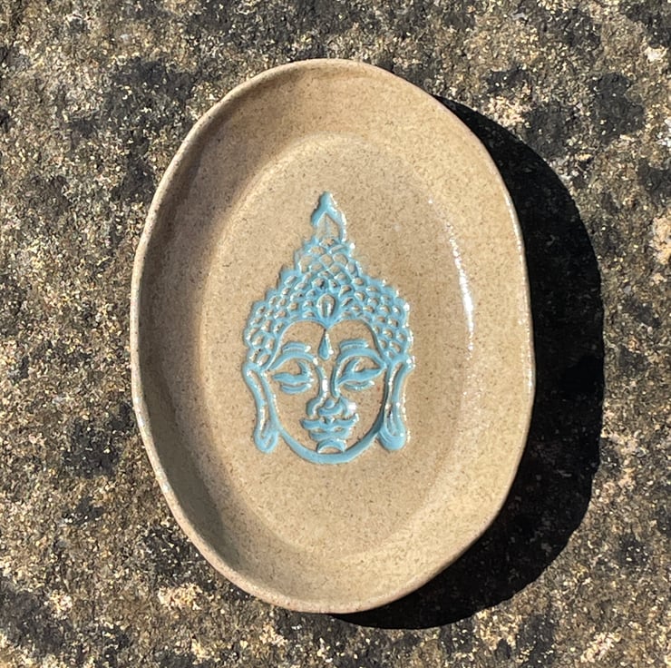 This is my ceramic oval dish with an aqua-blue Buddha design, it's perfect for trinkets, little treasures. It can also be used as a spoon rest, a soap dish or for your spare coins.