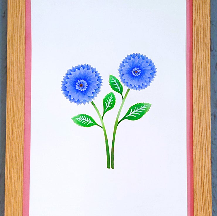 Framed high-quality coloured A3 print of my painting of blue dahlia on a white background with a hard backing. The print comes finished with a stylish pink border. Framed with an expensive Styrene Protective Perspex (which has same clarity of glass) ready to hang. Choose from three different types of frame; black, oak or dark oak(see images). Colours of print and border may differ slightly due to computer/phone settings. All purchases delivered within 7-10 working days.