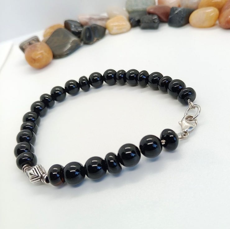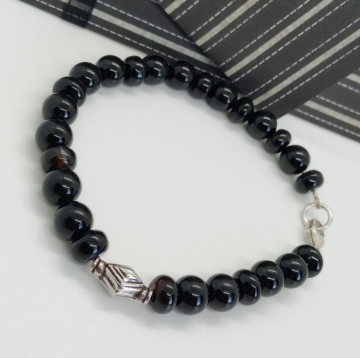 Black agate gemstone beads make up this bracelet with a sterling silver feature bead, the agate beads are 8 mm rounds and 8 mm x 5 wheel rondels spaced throughout, the Sterling silver feature beadwith a diamond pattern measures 1.3 cm x 7 mm, finished with sterling silver fastenings.