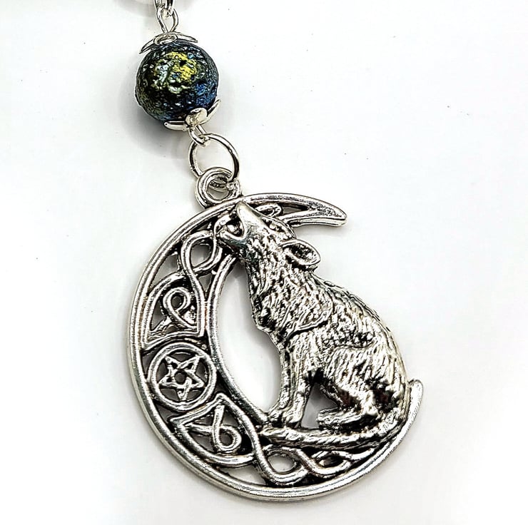 Moon, Stars and Wolf scarf ring - a striking depiction of a howling wolf seated on a crescent moon pendant. He is attached to an ornate scarf bail of silver stars by a beaded connector of iridescent blue green electroplated natural lava rock.