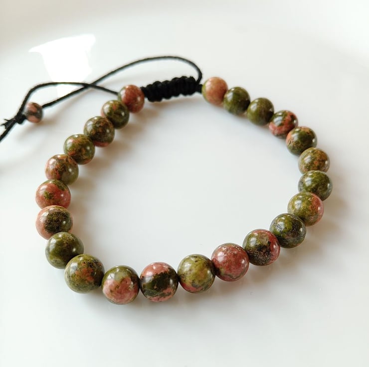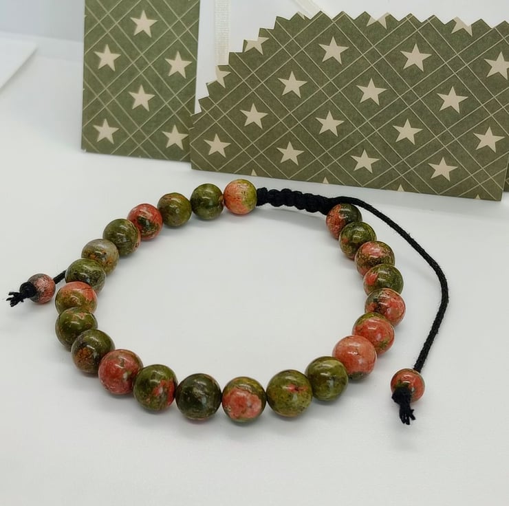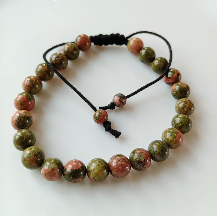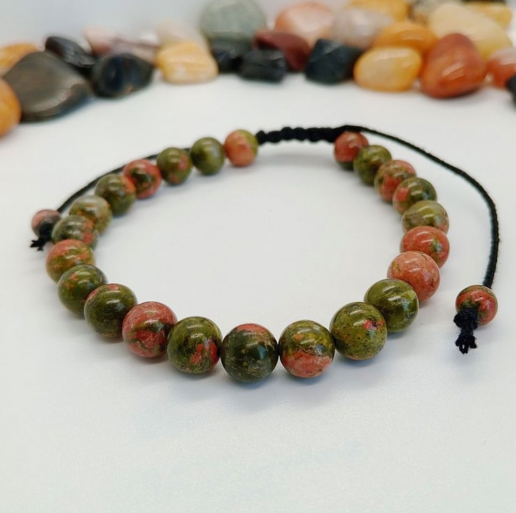 Different tones of greens and brick reds within the 8 mm round Unakite gemstone beads make up this bracelet, the gemstone beads are threaded onto strong cotton thong and fininshed with two smaller Unakite beads at the ends.