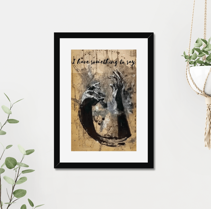 Let your walls speak with I Have Something to Say — a dynamic and thought-provoking art print by Ayrshire-based artist Rebecca Scott. Created in mixed media on vintage paper, this powerful composition focuses on two gesturing hands, captured in motion — expressive, urgent, and alive with meaning.