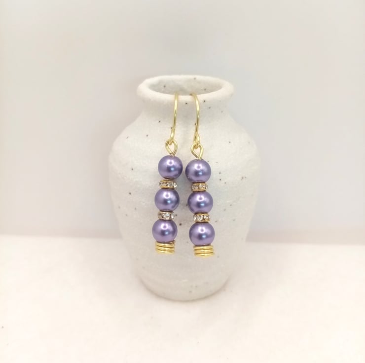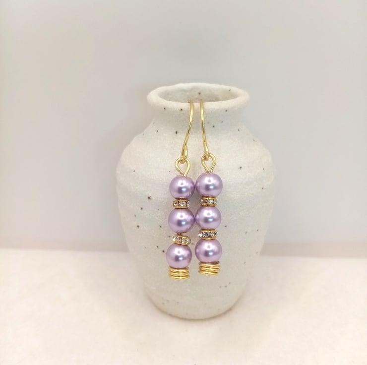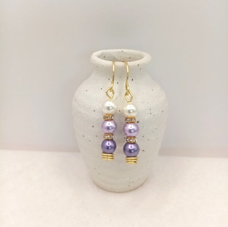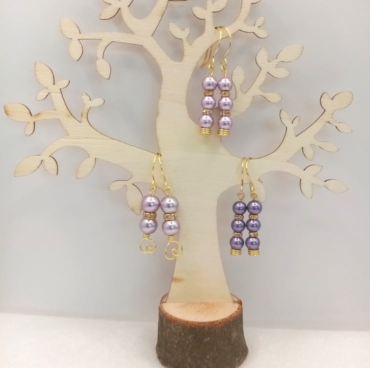 Glass pearl drop-earrings in purples and pinks.