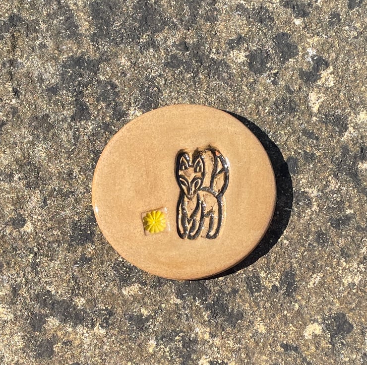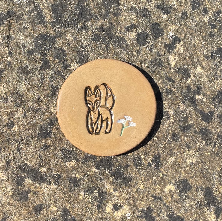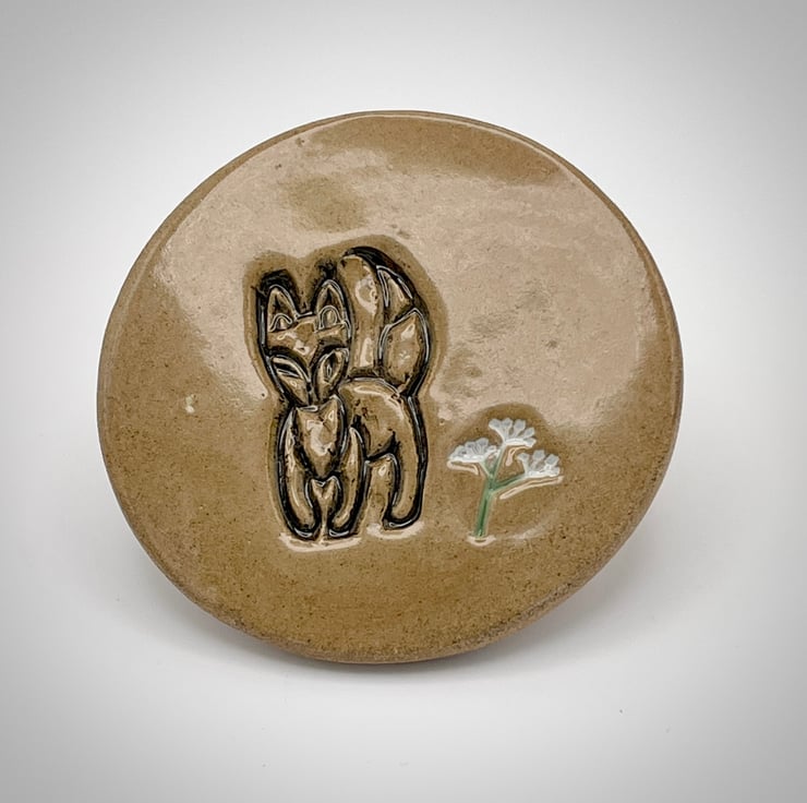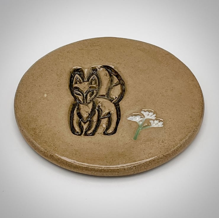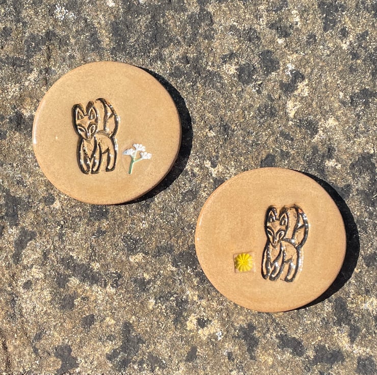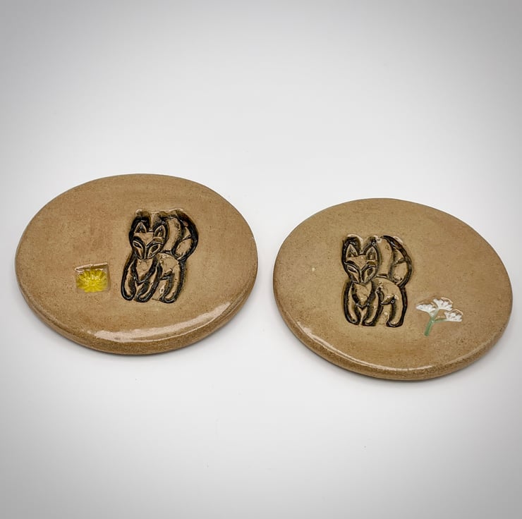 Each handcrafted ceramic coaster has been created using the slab-work method and embossed with a foxy design with a cow parsley or flower design added, before it is cut into a circular shape. Once dried it has been bisque fired to 1000c, after a gentle sanding it has been hand-painted with red-brown, yellow or green underglazes with a clear glaze added. After glazing it has had a second firing in the kiln to 1250c.