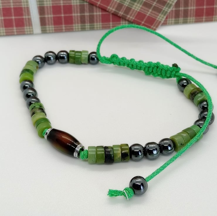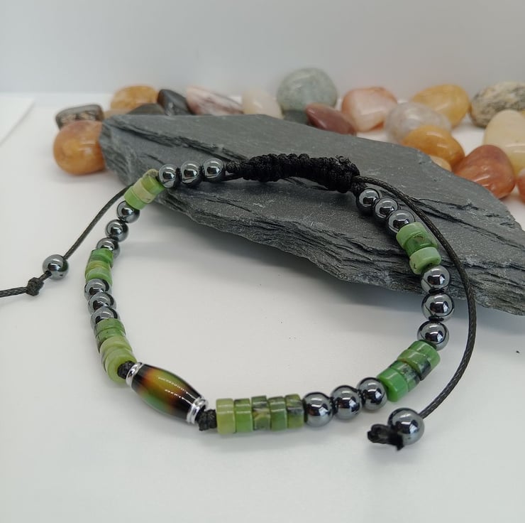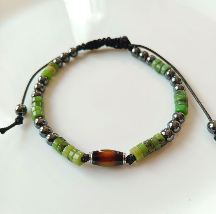 The rest of the bracelet is made up 6 mm round black hematite beads and 6 mm wheel rondel green chrysoprase gemstone beads, the gemstone beads are threaded onto strong thong and fininshed with two smaller hematite beads at the ends.