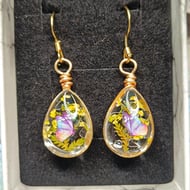 Delicately handcrafted with love, these enchanting earrings celebrate the beauty of the natural world. Featuring vibrant pink pressed flowers encased in shimmering glass cabochons, each piece is a unique tribute to nature’s fleeting moments. The floral centerpiece is accented with a charming butterfly detail, adding a whimsical, ethereal touch. Suspended from elegant 18ct gold plated earwires, the components are carefully wired by hand for lasting quality. Light, graceful, and inspired by nature, these earrings are a timeless accessory for any season.