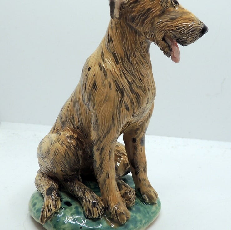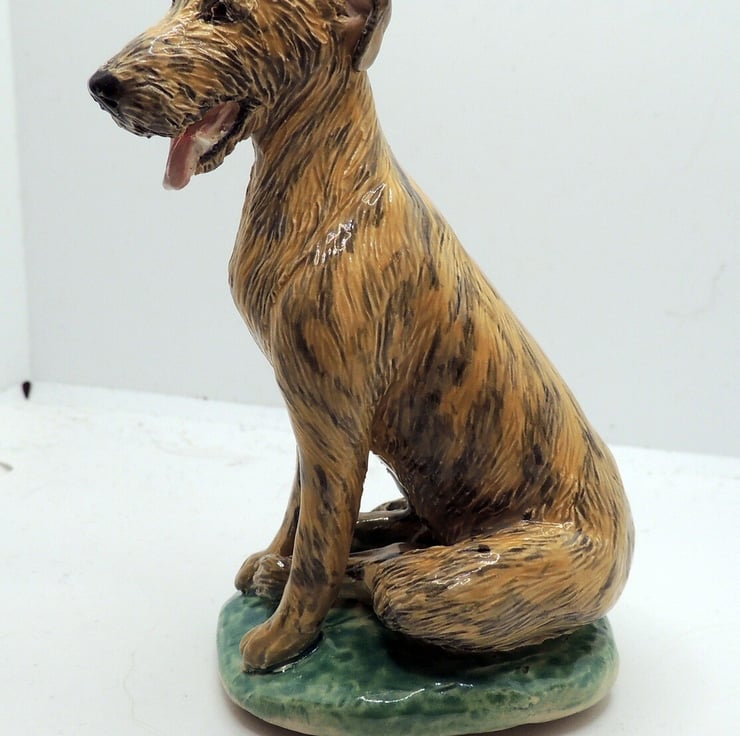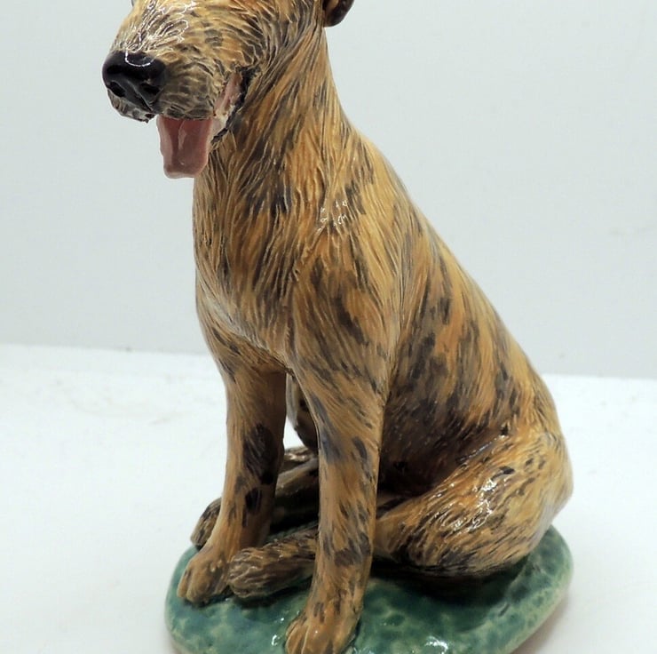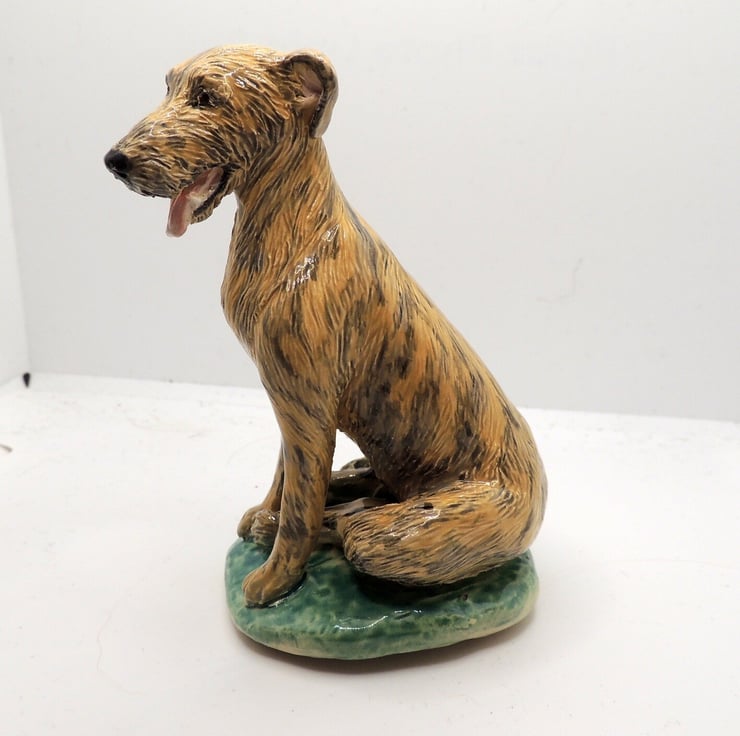 This little Wolfhound was made by myself without the use of moulds. He sits on a green base and measures in at around 3 and a half inches tall.