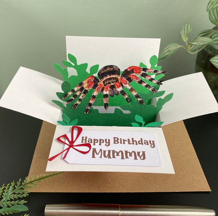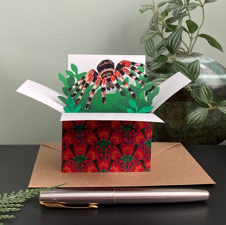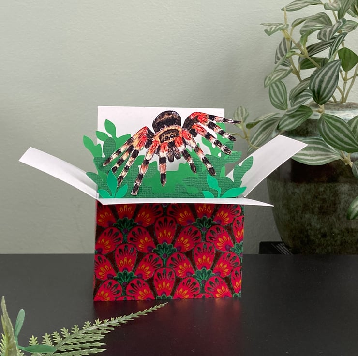 My Tarantula spider card can be personalised for any occasion: birthday, Thank you, Mother’s Day, Father’s Day, Anniversary, etc. or left blank. Every element of this spider in a box "pop up" card has been designed, drawn, cut and assembled by me including my ink and watercolour illustration of a Mexican red kneed tarantula and foliage cut from green card. The card base for this one has gold foiling and purple foiled dots.