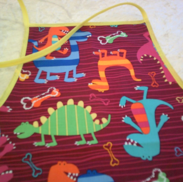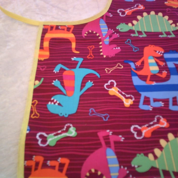 The fabric used has a design of colourful comical dinosaurs on a maroon background and is with a contrasting yellow bias binding.