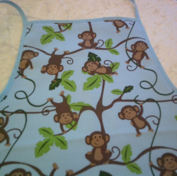 The fabric used has a design of Monkeys swinging in the trees on a pale blue background. It is edged a contrasting blue bias binding.