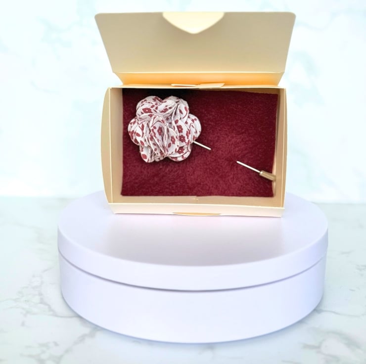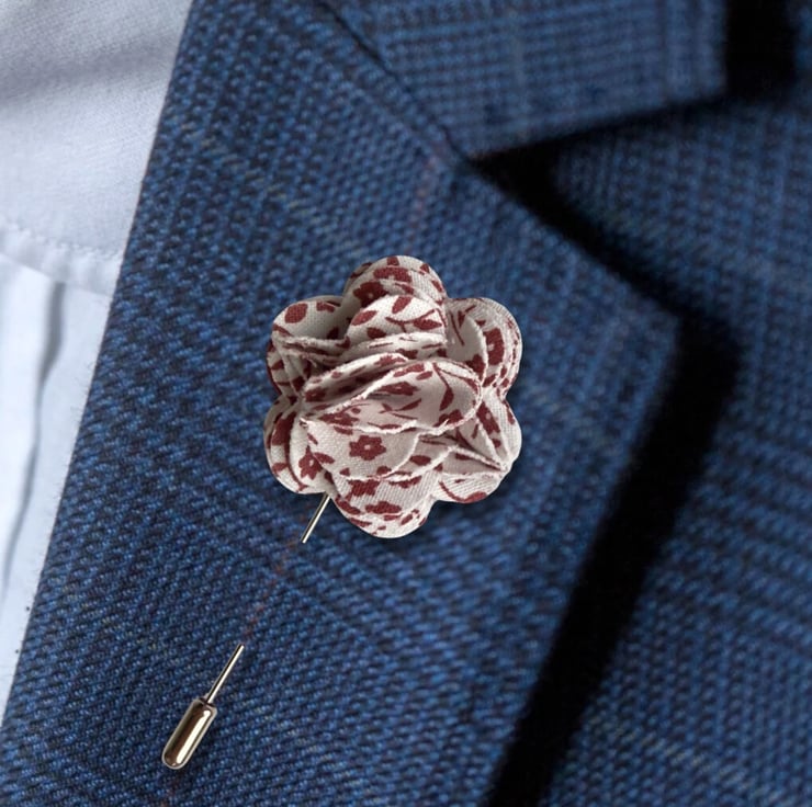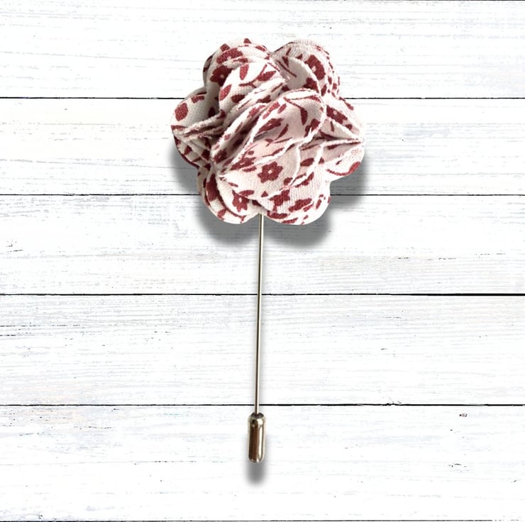 Add a subtle yet stylish finishing touch to your outfit with this handcrafted fabric flower lapel pin. Carefully sewn by hand using white and red floral-print fabric, this elegant accessory is the perfect finishing touch for weddings, parties or simply elevating your everyday suit.