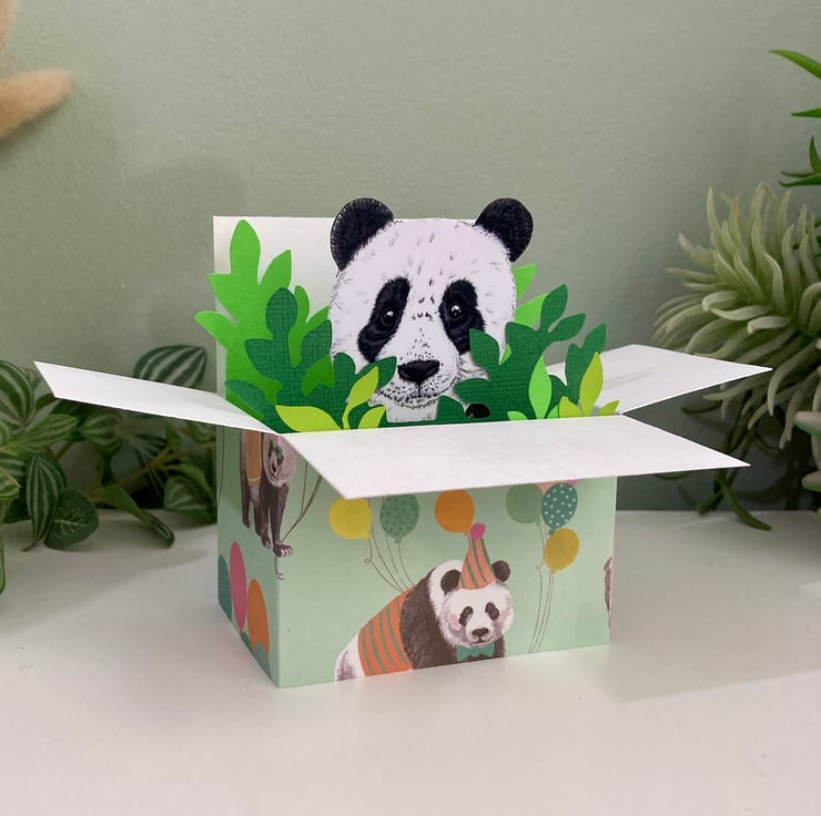 The patterned card “box” folds open to reveal a panda peeking from foliage cut from green card. A great little gift card for panda lovers. Designed and handmade entirely by me (including my panda painting) here in Devon.