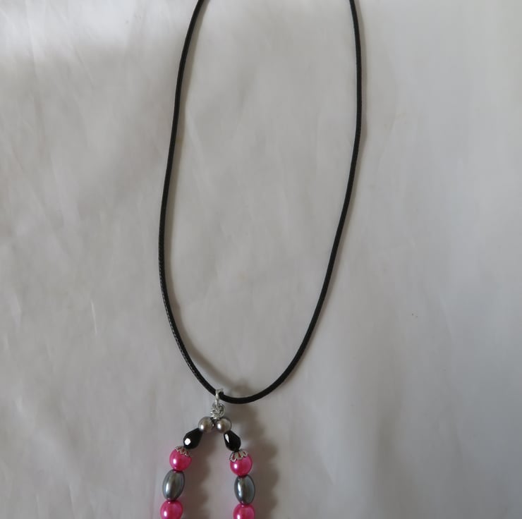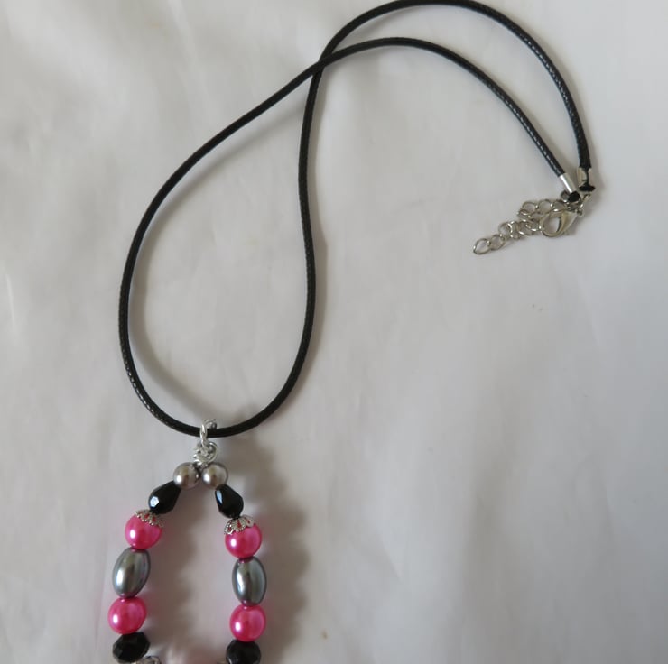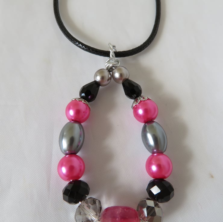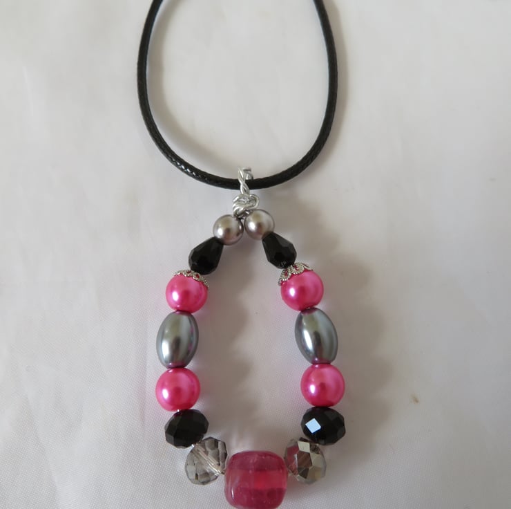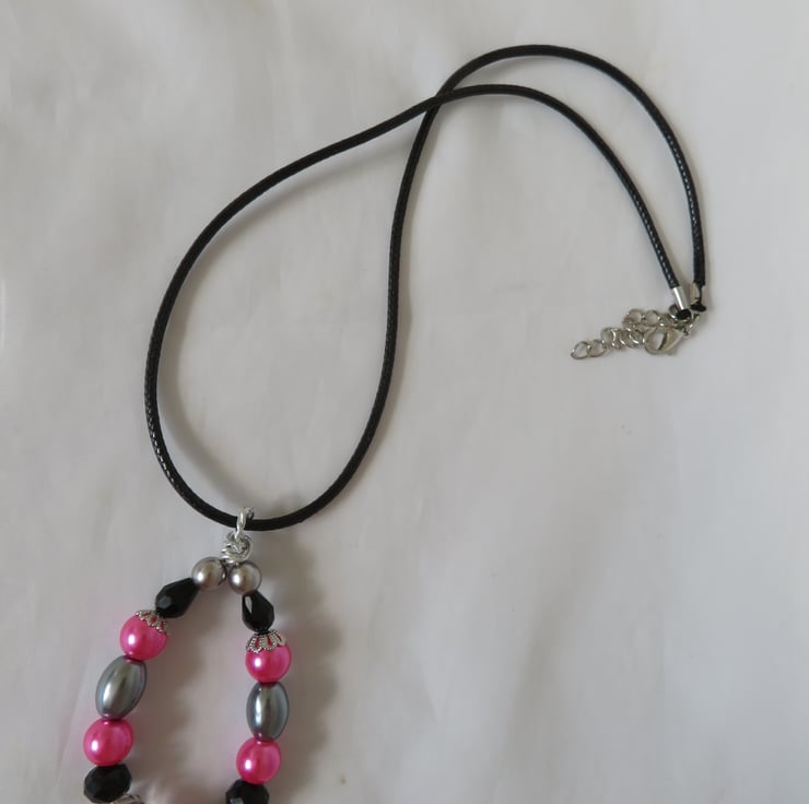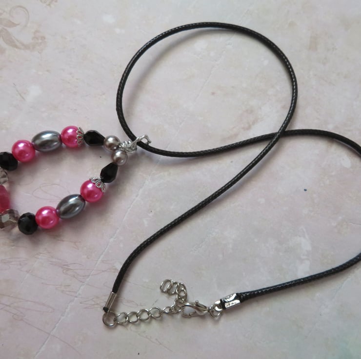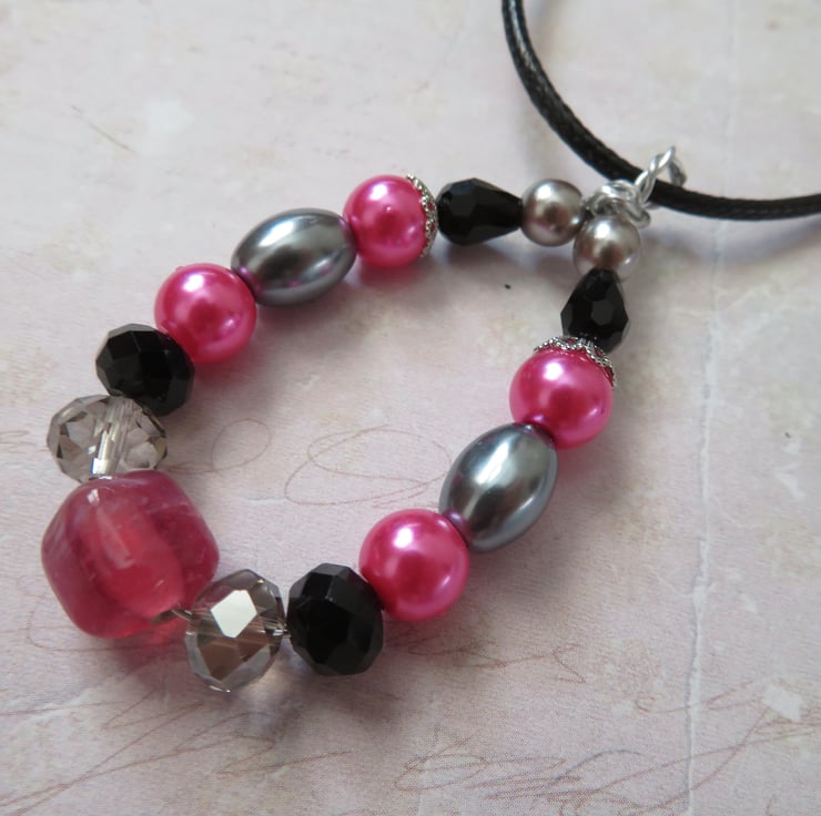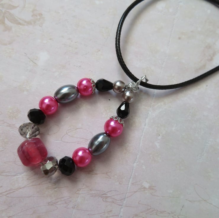 This elegant necklace features a hand-wired loop pendant, carefully adorned with fuchsia pink glass pearls, silver filigree bead caps, black teardrop crystals, iridescent silver half coated glass rondelles, darker grey acrylic oval pearls and a pink glass cubed bead and silver pearls.