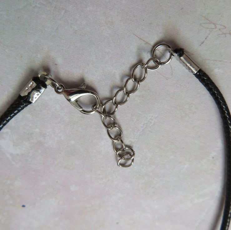 The pendant is strung on a thin black cotton braid choker string necklace, attached with a lobster clasp and extender chain.