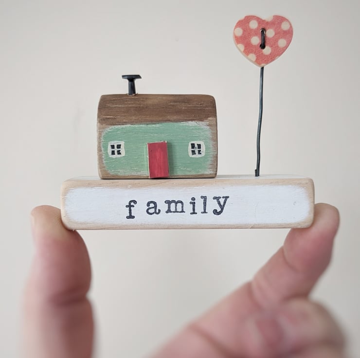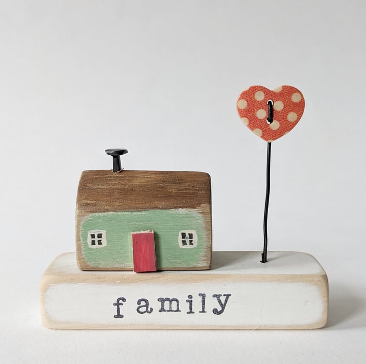 A hand stamped wooden base with a teeny painted house and a jolly heart on a wire to stand beside it.