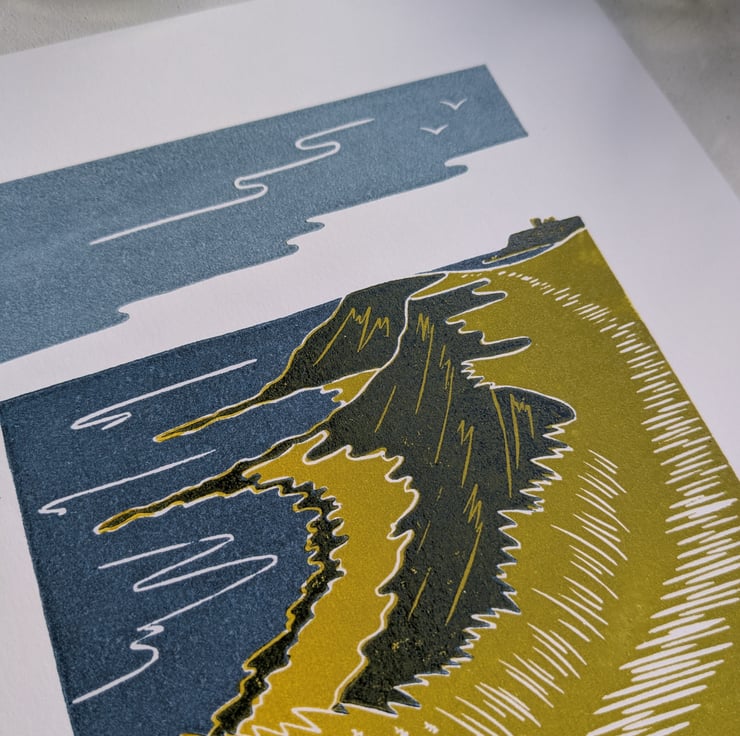 Each design is created using hand carved plate of traditional lino, carved with specialist tools and printed with a hand wound press, using Hawthorn Printmakers oil based inks onto 300 gsm Snowdon printmakers paper. Every print is unique and completely individual due to its handmade nature. It's always so satisfying peeling back to paper to reveal to final print.
