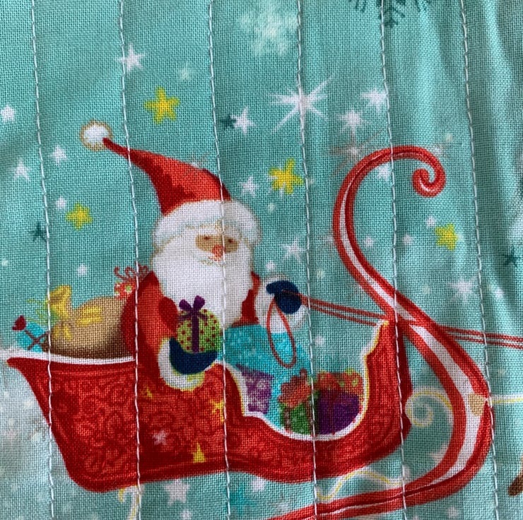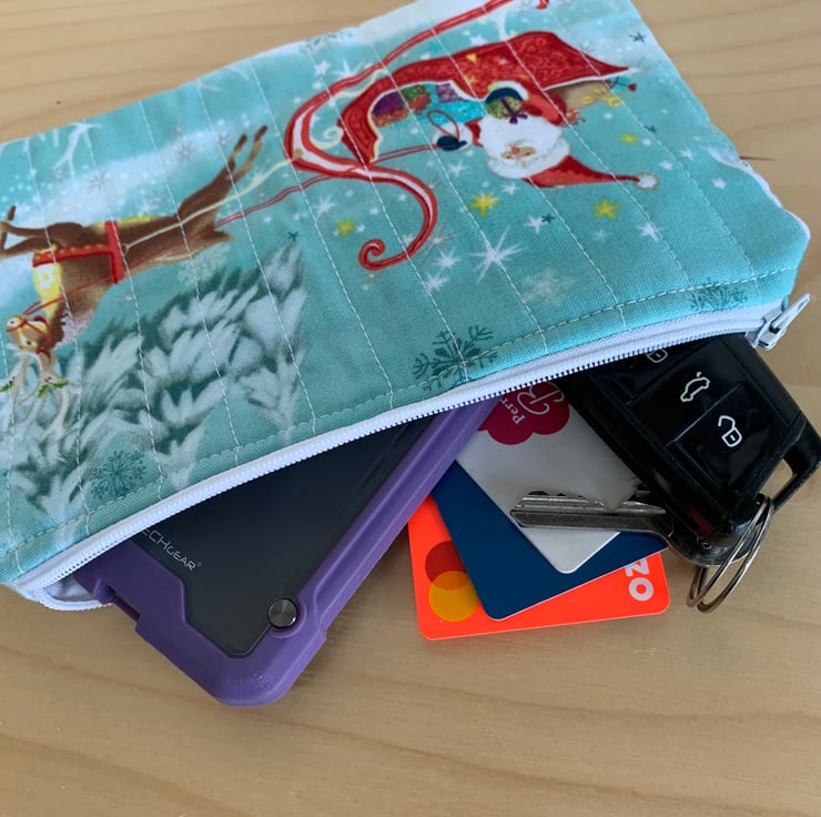 The pouch is made in this fun Christmas print cotton fabric featuring Father Christmas on his sleigh on one side and a snowman on the other side.