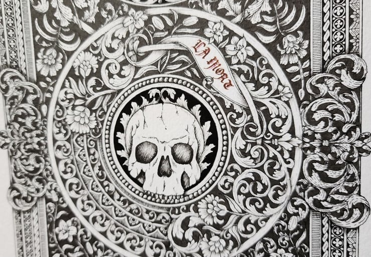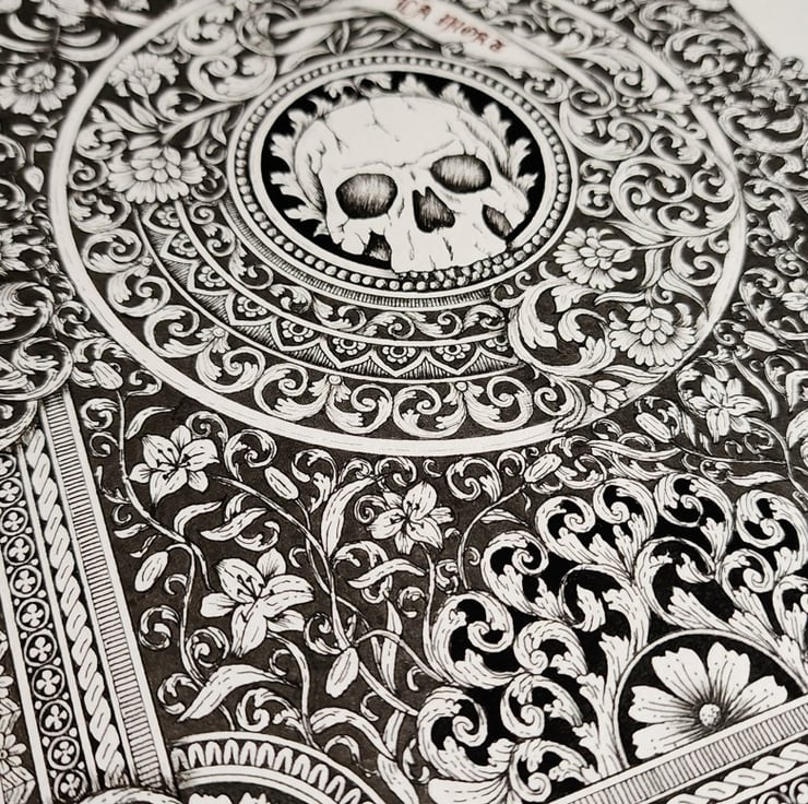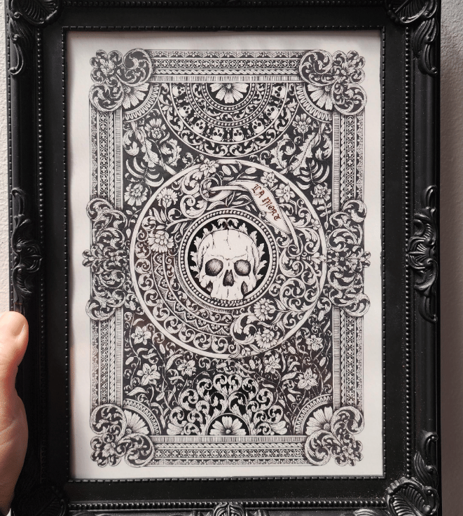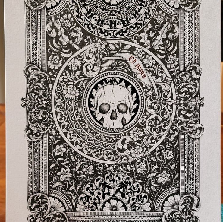 A 12 x 8 inch matte print of a hand-drawn black ink artwork; a skull surrounded by detailed, ornate decorations of swirling acanthus leaves, lily flowers, a banner that reads 'LA MORT' in red ink blackletter script, in a border of rows of repeating gothic-looking patterns.