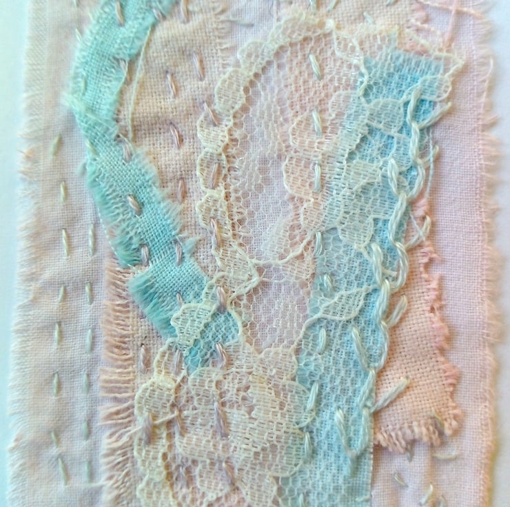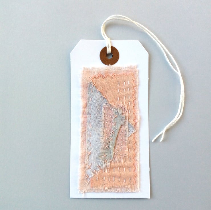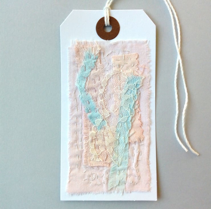 Fabric scraps are hand painted and arranged to create small textile collages which are embellished with slow stitching before adding to card tags.