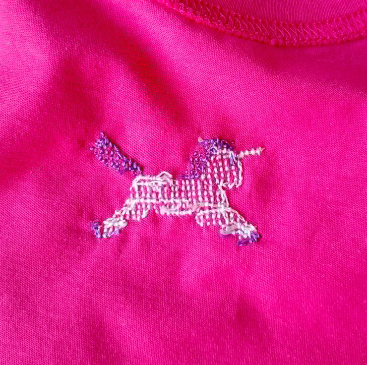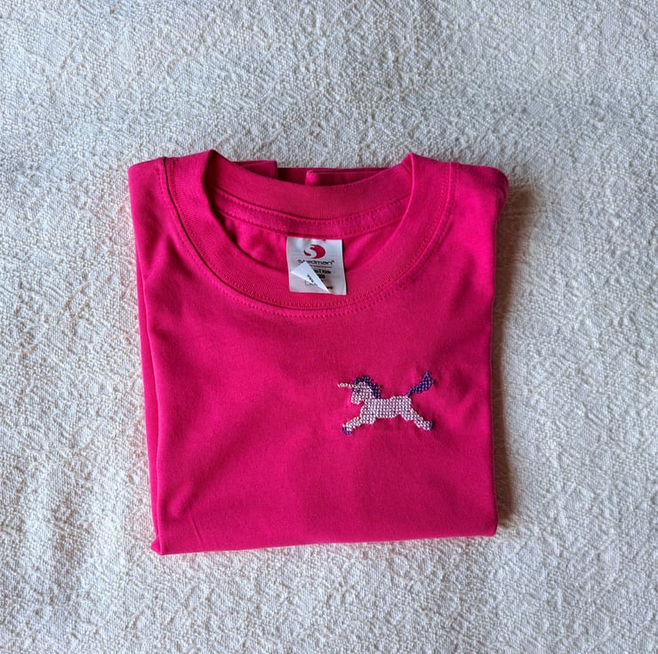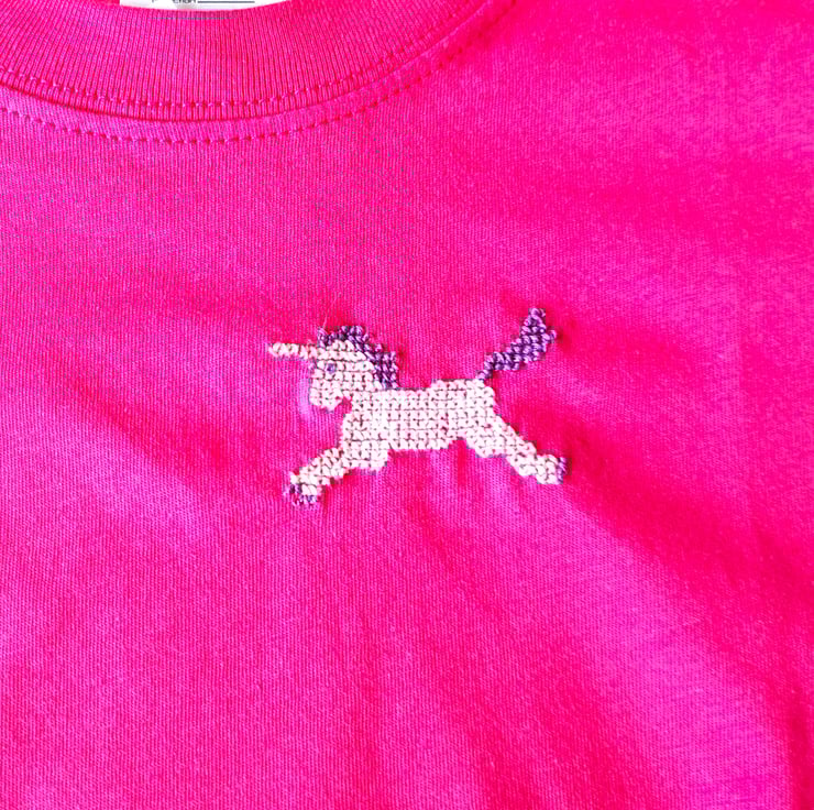 A white hand-stitched unicorn prances across the left front of this deep pink T-shirt. It has a sparkly ivory horn and purple eye, mane, tail and hooves. As I never use a permanent backing material when hand embroidering kids' clothing, there is nothing inside the shirt to irritate your child's skin. The shirt has a round neck and short sleeves. It is all cotton and can be machine washed.