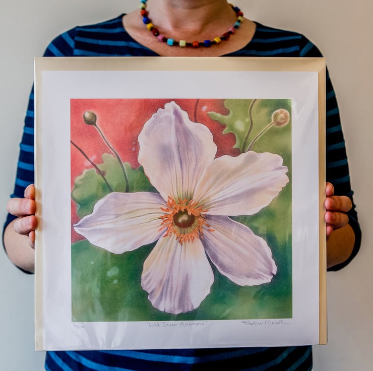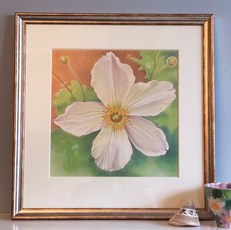 This is a detailed illustration of a beautiful flower which I came across in Kew Gardens, London. It is a 'Wild Swan' Anemone. I drew it using chalk pastels and coloured pencils on cream paper. The result is a lovely retro style, Georgia O'Keefe inspired Art Print!