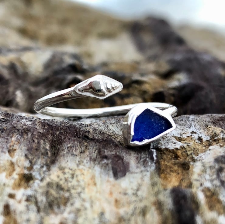 This beautiful piece of cobalt blue sea glass was found along the UK's South West coastline and has been set in a fine silver bezel (.999) with a recycled (ecosilver) sterling silver (.925) 1.5 wire to form a unique adjustable silver ring. A sterling silver shell detail has been added to this ring.
