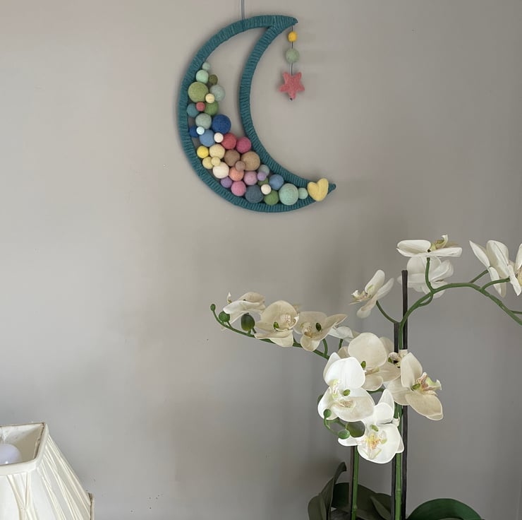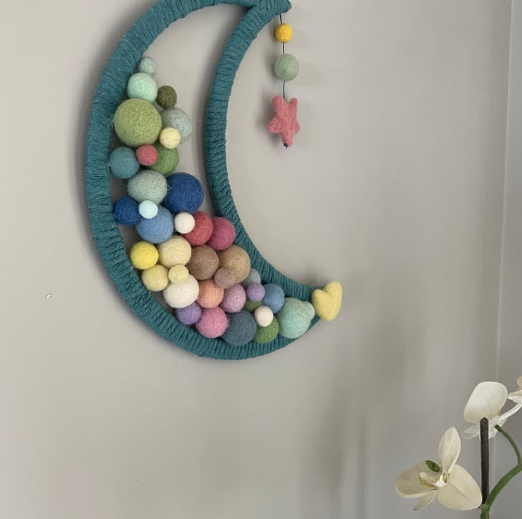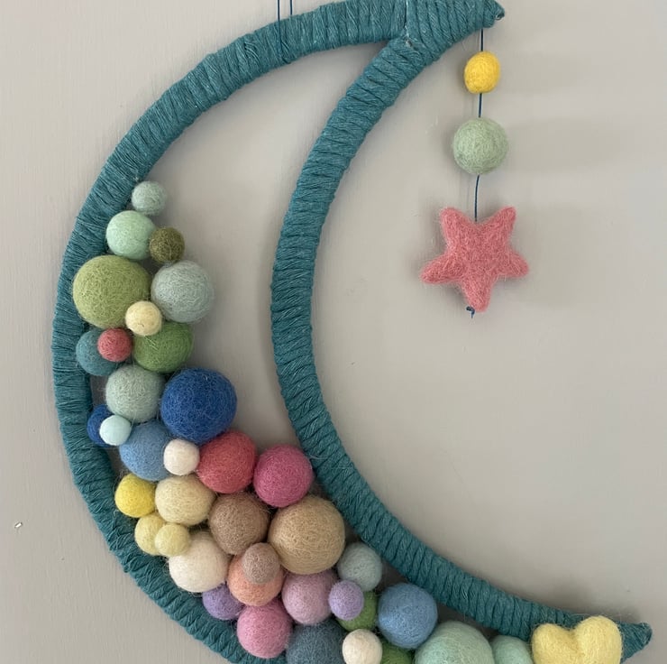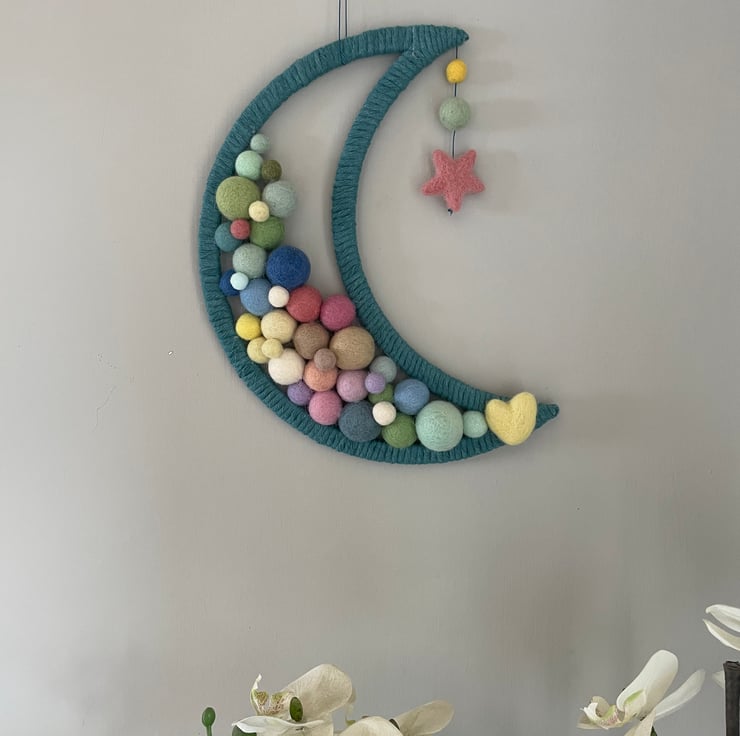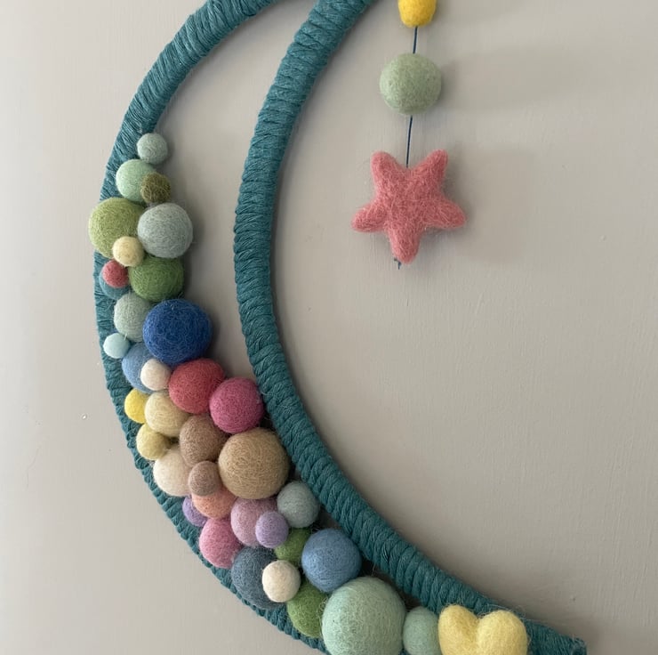 Perfect for adding texture to a wall this pretty colorful half moon has been created using 100 % handmade marino wool balls of various sizes.