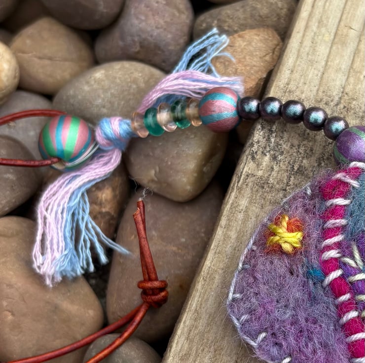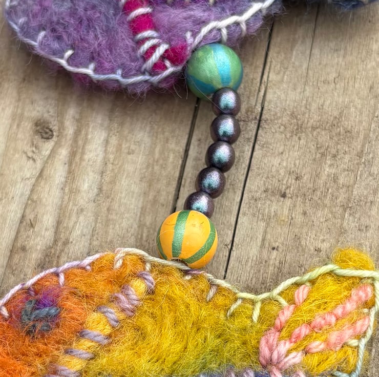 This 360 degree hanging ornament is created from needle felted and embroidered pieces strung on a leather thong with a mix of handed painted wooden and glass beads.