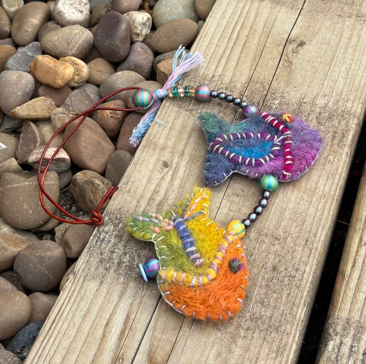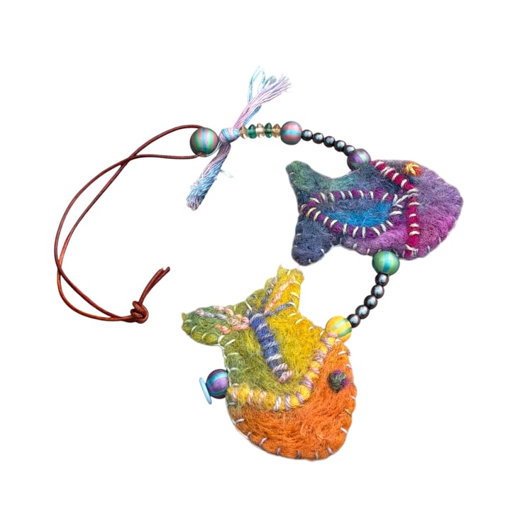 Designed to be viewed from all angles this piece has two felted fish designs which I have created by needle felting wool fibre and yarn into a plain motif. I then use yarn and embroidery to add colour, pattern and detail to the shape.