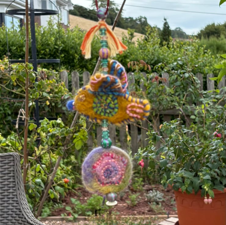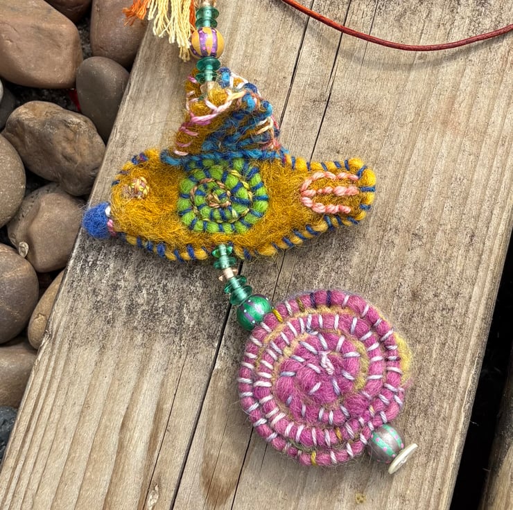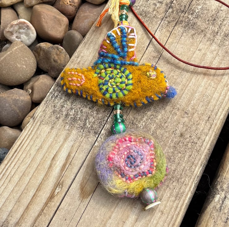 Designed to be viewed from all angles this piece has bird and disc felted designs which I have created by needle felting wool fibre and yarn into a plain motif. I then use yarn and embroidery to add colour, pattern and detail to the shape.
