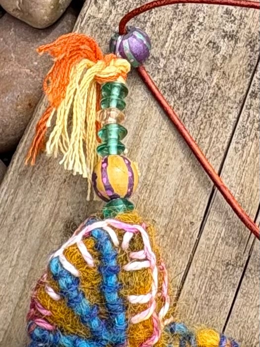 This 360 degree hanging ornament is created from needle felted and embroidered 3 dimensional pieces strung on a leather thong with a mix of handed painted wooden and glass beads.