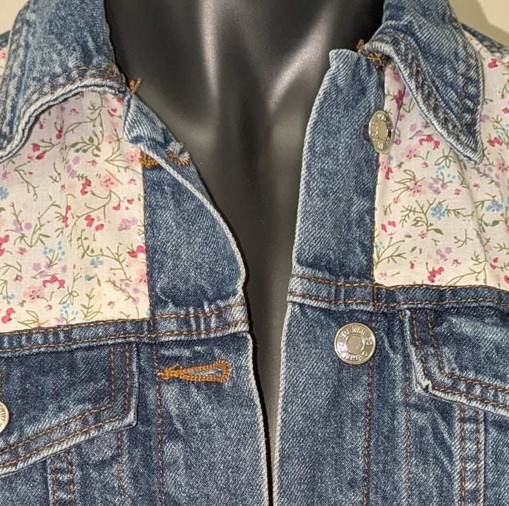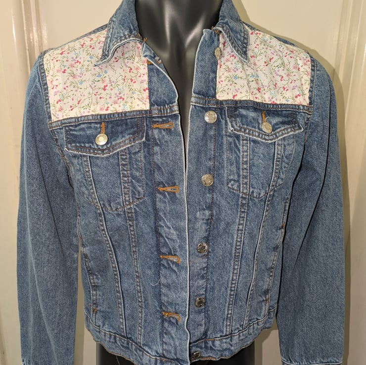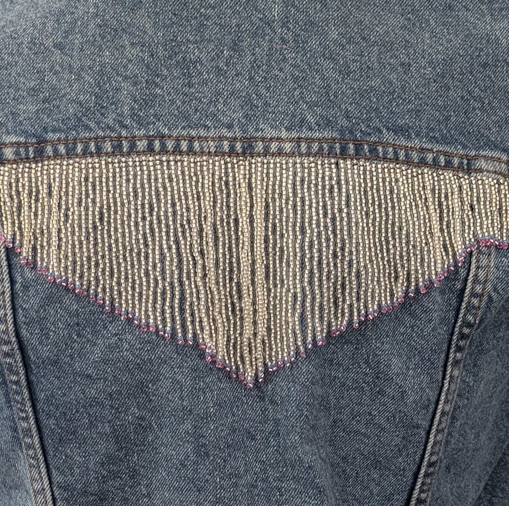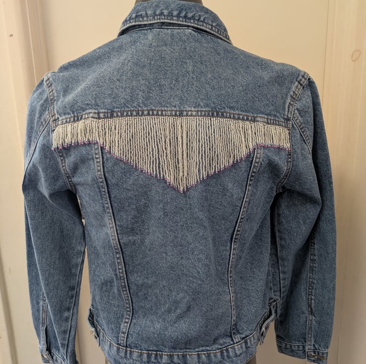 An up-cycle brand new (never worn) denim jacket. Size 12 ladies. The front has pretty dainty blue and pink flower hand sewn patches under the collar. On the back is a delicate hand sewn fringe of silver, pink and blue beads.