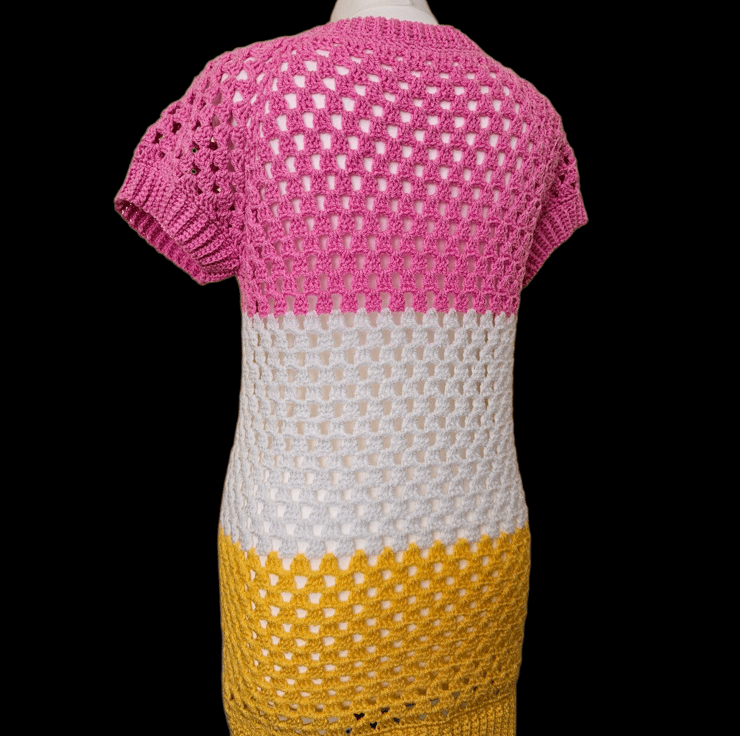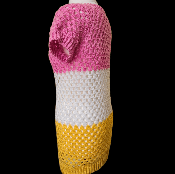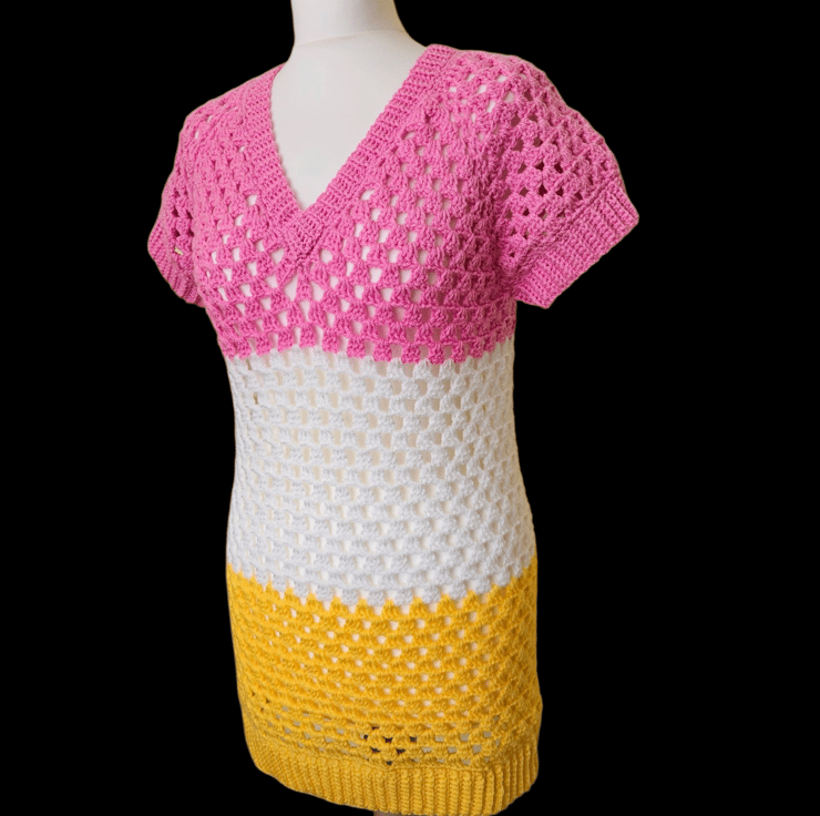 This beautiful short-sleeve V-neck can be styled as either a long jumper or a mini dress. Made from 100% premium acrylic yarn, it’s incredibly soft and machine washable.