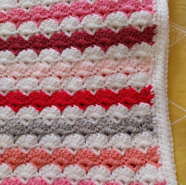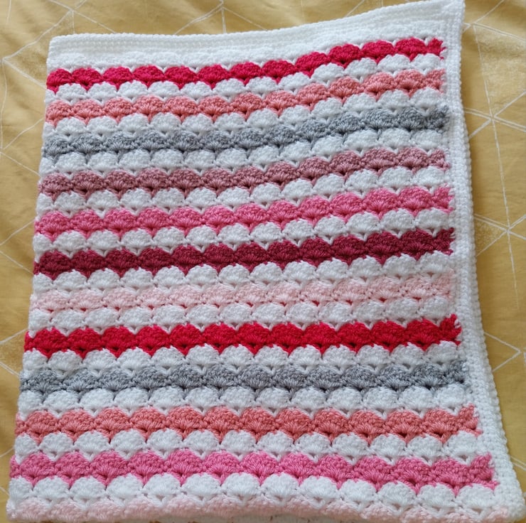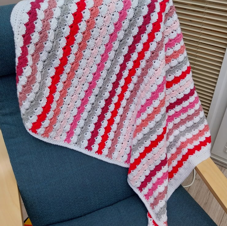 Soft snuggly blanket perfect for a baby, crocheted in a shell pattern, in shades of pink and a grey stripe, the border and every other stripe is white.