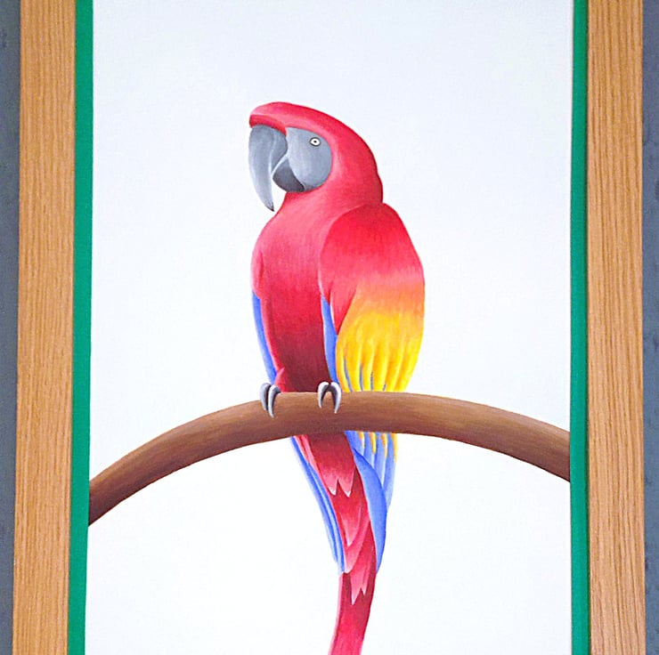Framed high-quality coloured A3(42cm x 30cm) Giclee print of my painting of a Macau/Parrot perched on a branch on a white background with a hard backing. The print comes finished with a stylish, modern dark green border. Framed with an expensive Styrene Protective Perspex (which has same clarity of glass) ready to hang. Buyer can choose from three types of frame; Black, Oak or Dark Oak. Colours of print with border may differ slightly due to computer/phone settings. All purchases delivered within 7-10 working days.