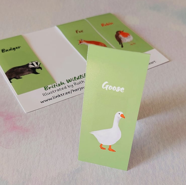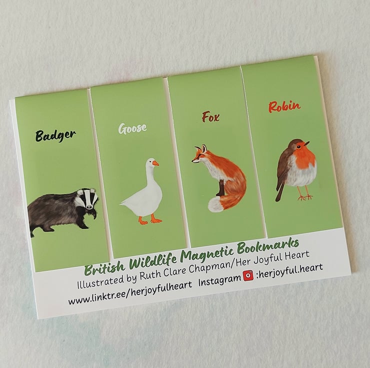 This is a set of four delightful magnetic bookmarks, each one featuring my original illustration of a British animal or bird including: Badger, Goose, Fox and Robin.