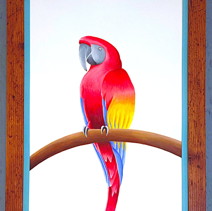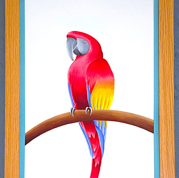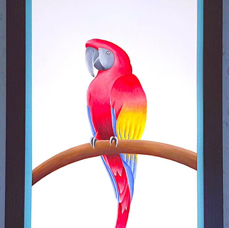 Framed high-quality coloured A3(42cm x 30cm) Giclee print of my painting of a Macau/Parrot perched on a branch on a white background with a hard backing. The print comes finished with a stylish, modern sky blue border. Framed with an expensive Styrene Protective Perspex (which has same clarity of glass) ready to hang. Buyer can choose from three types of frame; Black, Oak or Dark Oak. Colours of print with border may differ slightly due to computer/phone settings. All purchases delivered within 7-10 working days.