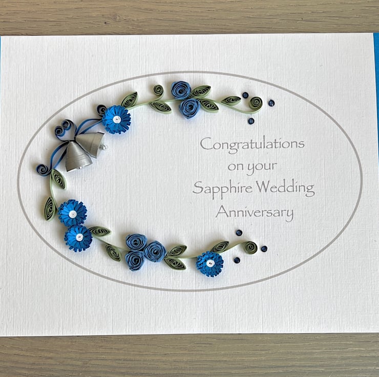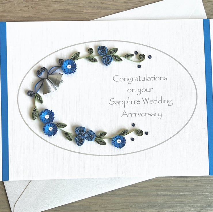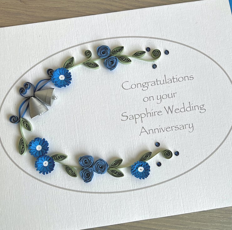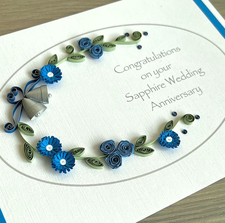 A beautiful quilled sapphire anniversary card with quilling flowers and bells. An original, distinctive handmade greetings card to celebrate a milestone anniversary – a great keepsake.