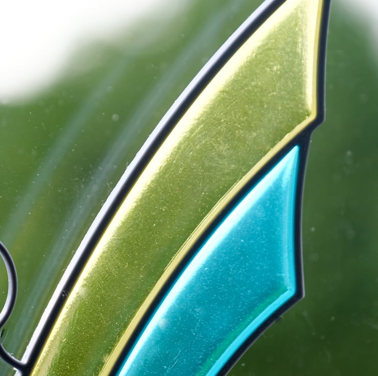 I spent a long time working on the size and shape of my angels, so they would float in your window space looking vibrant and beautiful but not intrusive. The resin colours have a lightness and delicacy that I associate with higher places and they are lovely beings to have in your home. 21cm high and 14.5cm wide at the wingtips, they are suspended by fine transparent line and the backs have two coats of artist's UV-resistant varnish for protection.