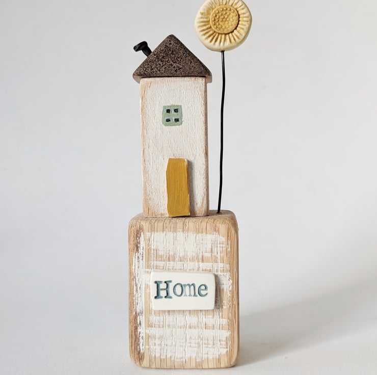 This is one of my tiny little rustic huts with a painted window, a happy flower, and a hand stamped base.