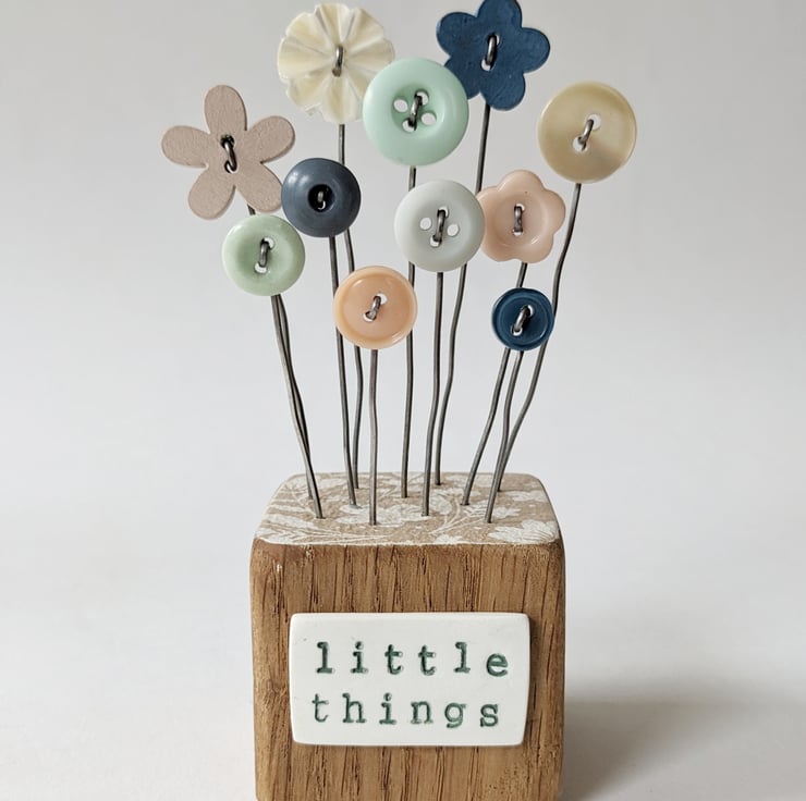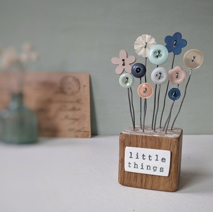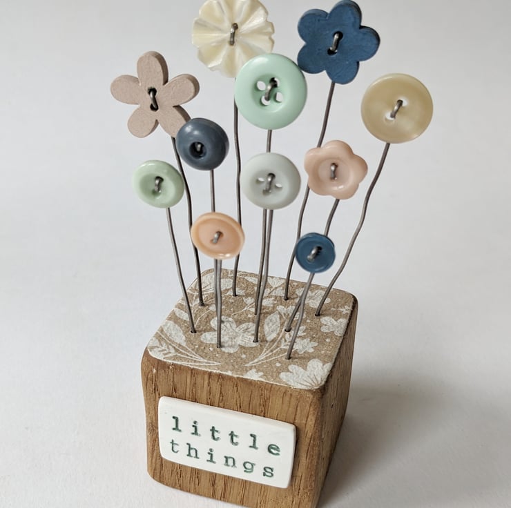 Button flowers grow in this little garden. They stand on their wire stalks in a decoupaged wooden block with little clay stamped words on the front.
