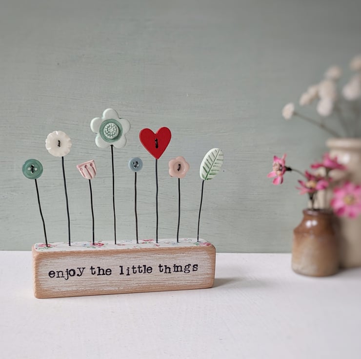 Button flowers grow in a row in this little garden with a clay leaf and flowers. They stand on their wire stalks in a wooden block with a decoupaged floral top.