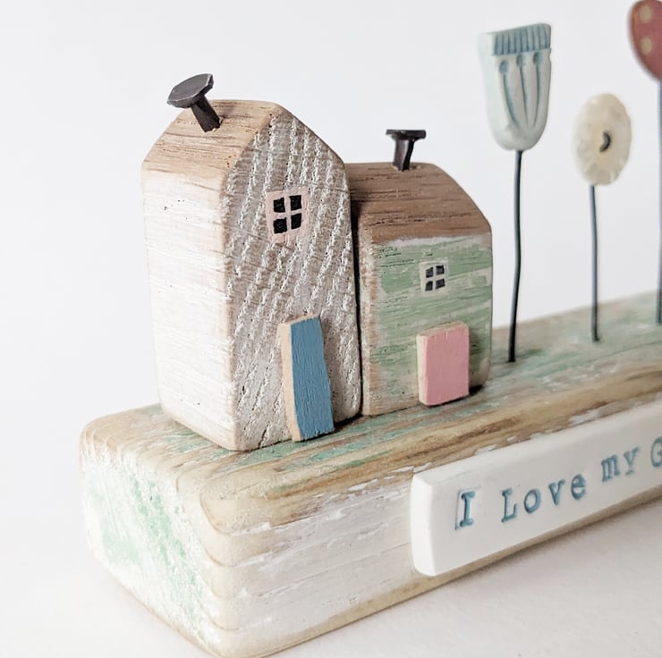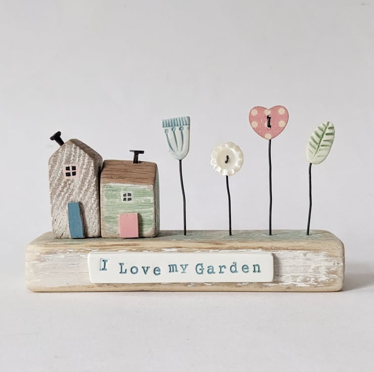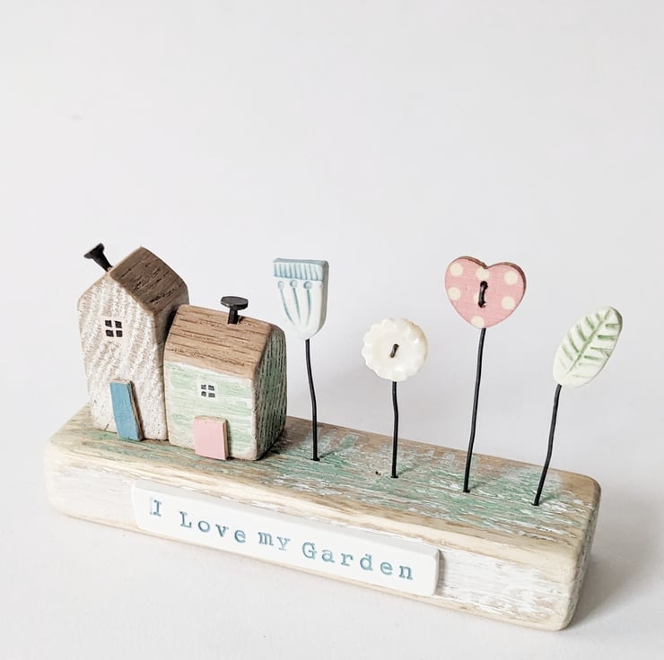 These little hand-painted wooden homes have teeny doors and windows and a garden of button and clay flowers.